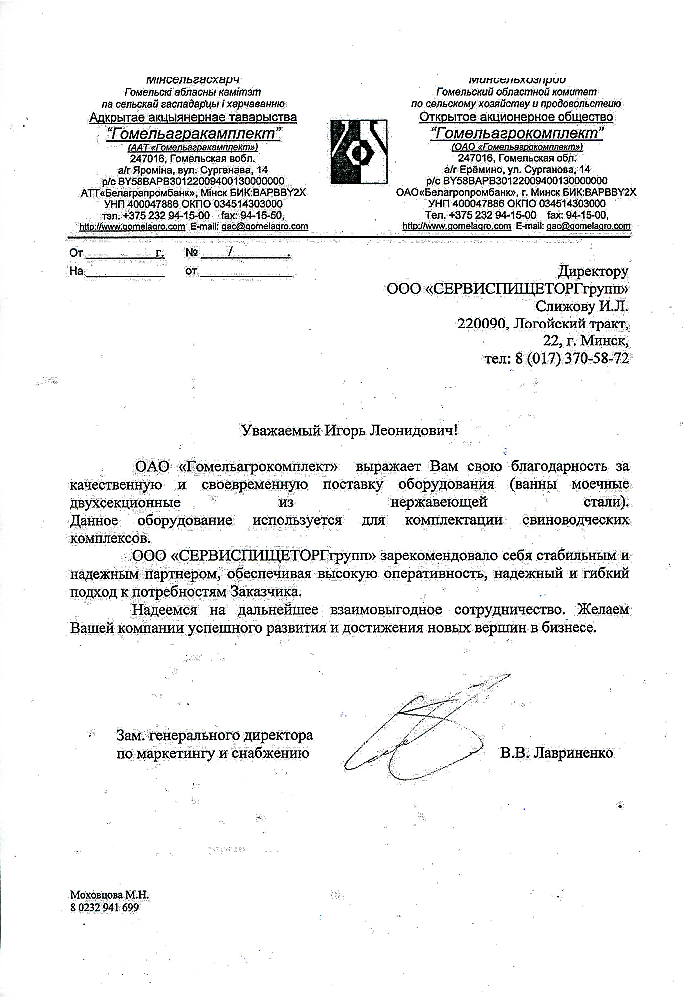 ОАО «Гомельагрокомплект» выражает Вам свою благодарность за качественную и своевременную поставку оборудования (ванны моечные двухсекционные из нержавеющей стали). Данное оборудование используется для комплектации свиноводческих комплексов.