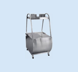 На верхней столешнице расположены емкости для столовых приборов. Снизу расположен закрытый отсек для дополнительных подносов или инвентаря.