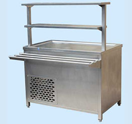 Предназначен для хранения, демонстрации и раздачи напитков и продуктов питания. Захолаживание происходит в объеме специальной ниши столешницы с помощью испарителя, закрепленного к днищу ниши. Конструктивно и функционально «холодный стол» соответствует столу-тумбе «холодильной витрины». Минимальная температура в охлаждаемом объеме колеблется в пределах от +2°С на поверхности до +10°С на высоте 60 мм от поверхности ванны. В зависимости от условий эксплуатации модуля (температура, относительная влажность и т.д.) возможна корректировка режима его работы с помощью регулятора температуры, расположенного в верхней части агрегатного отсека. Понижение температуры обеспечивается поворотом ручки регулятора по часовой стрелке. Хладагент холодильного агрегата — R134A.