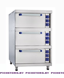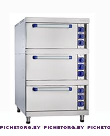 ШЖЭ-3 (лицевая часть из нерж. стали)- трехсекционный жарочный шкаф. Каждая духовка имеет три противня размером 530х470х30 мм., изготовленные из черного металла. Имеет раздельную регулировку мощности верхнего и нижнего блоков ТЭНов. Рабочий диапазон температуры 65-270оС, установленный аварийный терморегулятор предохраняет шкаф от перегрева свыше 300оС. Шкаф имеет крашенную подставку и боковые и заднюю облицовки, а также регулируемые по высоте ножки.